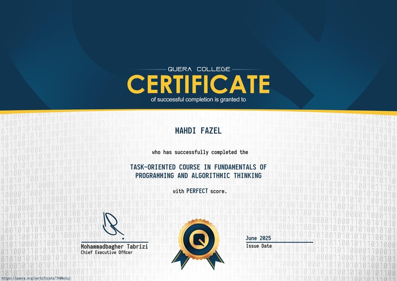 این گواهی تایید میکند که مهدی فاضل دوره مبانی برنامهنویسی و تفکر الگوریتمی را با سطح Perfect به پایان رسانیده است.