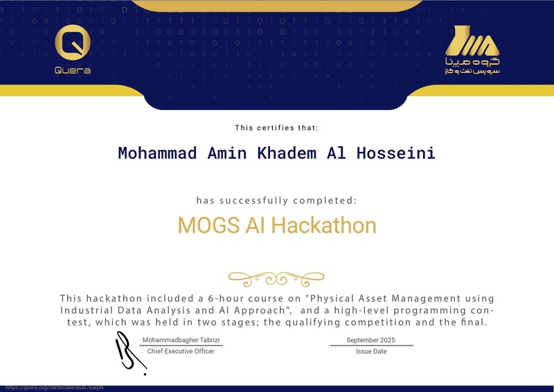 این گواهی تایید میکند که Mohammad Amin Khadem Al Hosseini هکاتون هوش مصنوعی MapnaAI را به پایان رسانیده است.