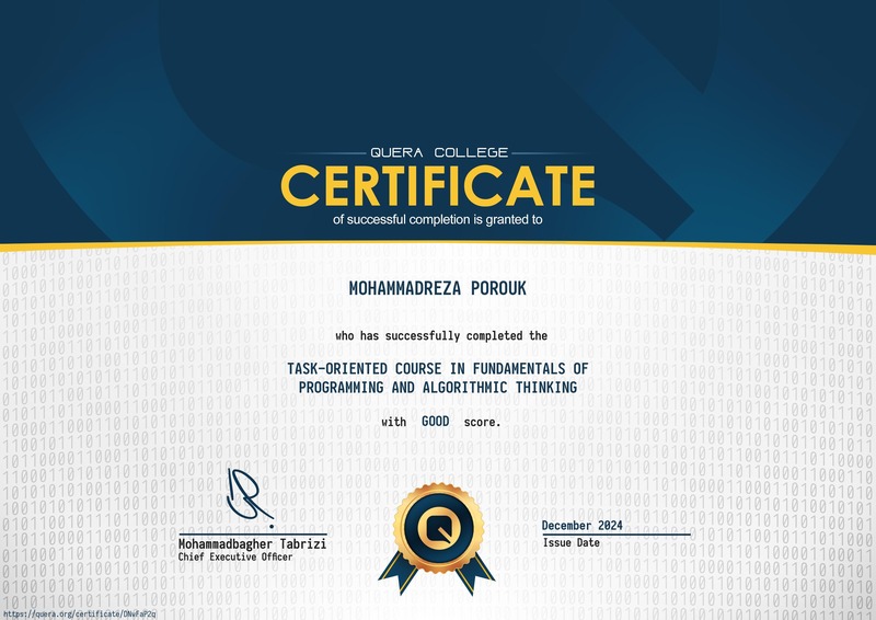 این گواهی تایید میکند که محمدرضا پروک دوره مبانی برنامهنویسی و تفکر الگوریتمی را با سطح Good به پایان رسانیده است.