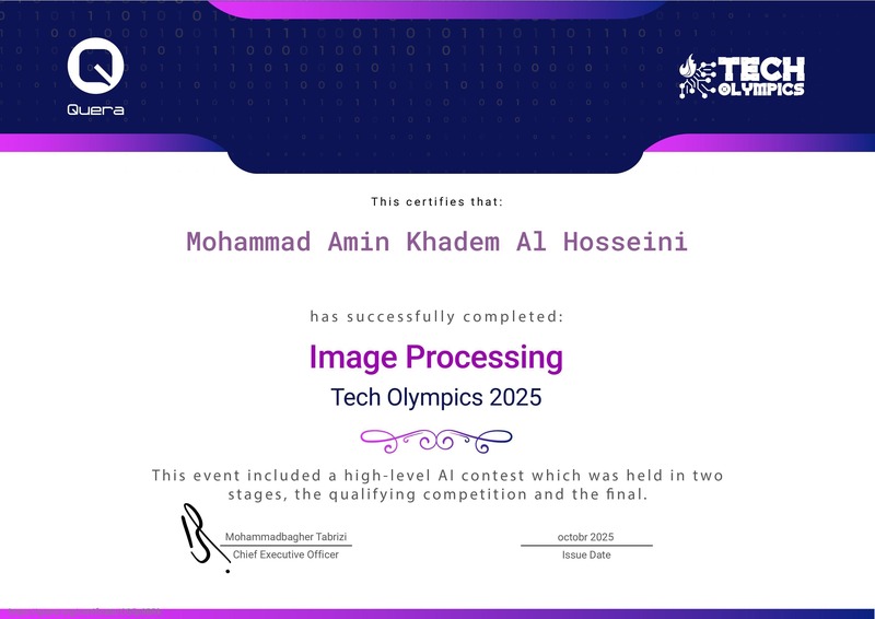 این گواهی تایید میکند که Mohammad Amin Khadem Al Hosseini المپیک فناوری ۲۰۲۵- پردازش تصویر را به پایان رسانیده است.