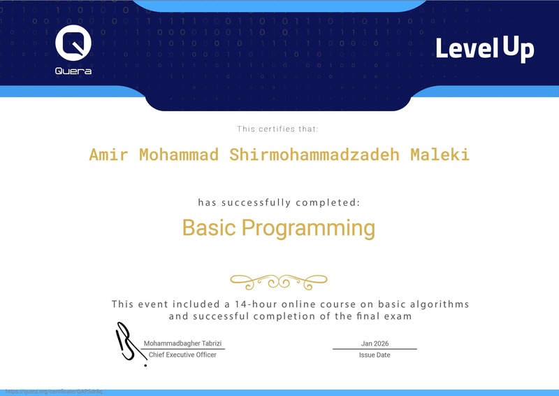 این گواهی تایید میکند که امیرمحمد شیرمحمدزاده ملکی Level up مبانی برنامهنویسی را به پایان رسانیده است.