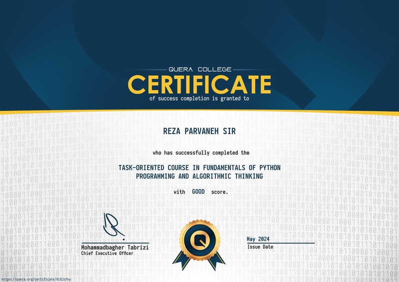 این گواهی تایید میکند که Reza Parvaneh sir دوره مبانی برنامهنویسی و تفکر الگوریتمی را با سطح Good به پایان رسانیده است.