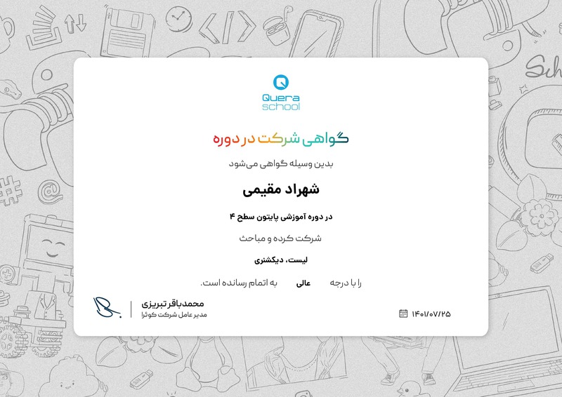 این گواهی تایید میکند که شهراد مقیمی دوره آموزش پایتون، سطح ۴ را با سطح عالی به پایان رسانیده است.