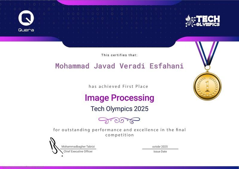 این گواهی تایید میکند که Mohammad Javad Veradi Esfahani المپیک فناوری ۲۰۲۵- پردازش تصویر را به پایان رسانیده است.