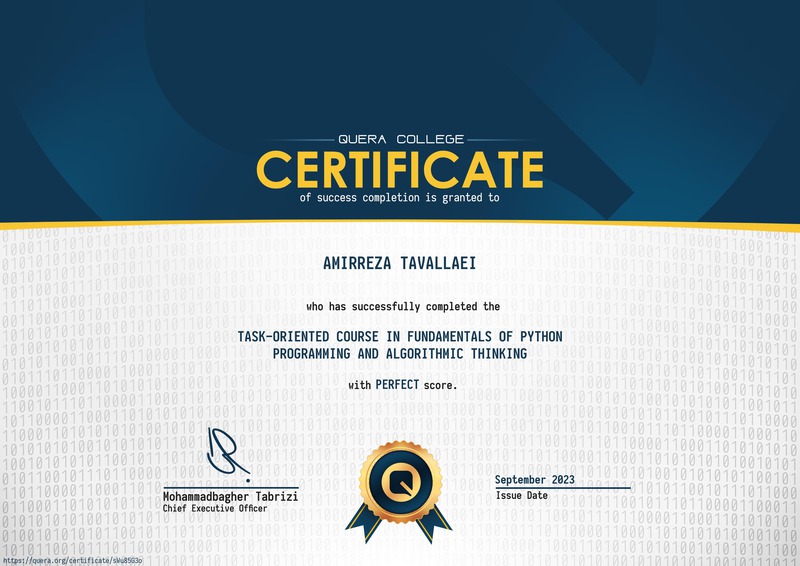 این گواهی تایید میکند که امیررضا تولائی دوره مبانی برنامهنویسی و تفکر الگوریتمی را با سطح Perfect به پایان رسانیده است.