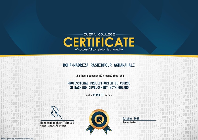 این گواهی تایید میکند که محمدرضا رشیدپور آقامحلی دوره جامپ بکاند با گولنگ را با سطح Perfect به پایان رسانیده است.