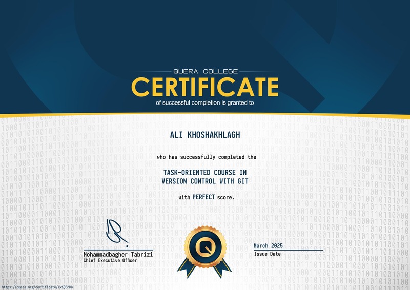این گواهی تایید میکند که علی خوش اخلاق دوره آموزش عملی کار با گیت را با سطح Perfect به پایان رسانیده است.